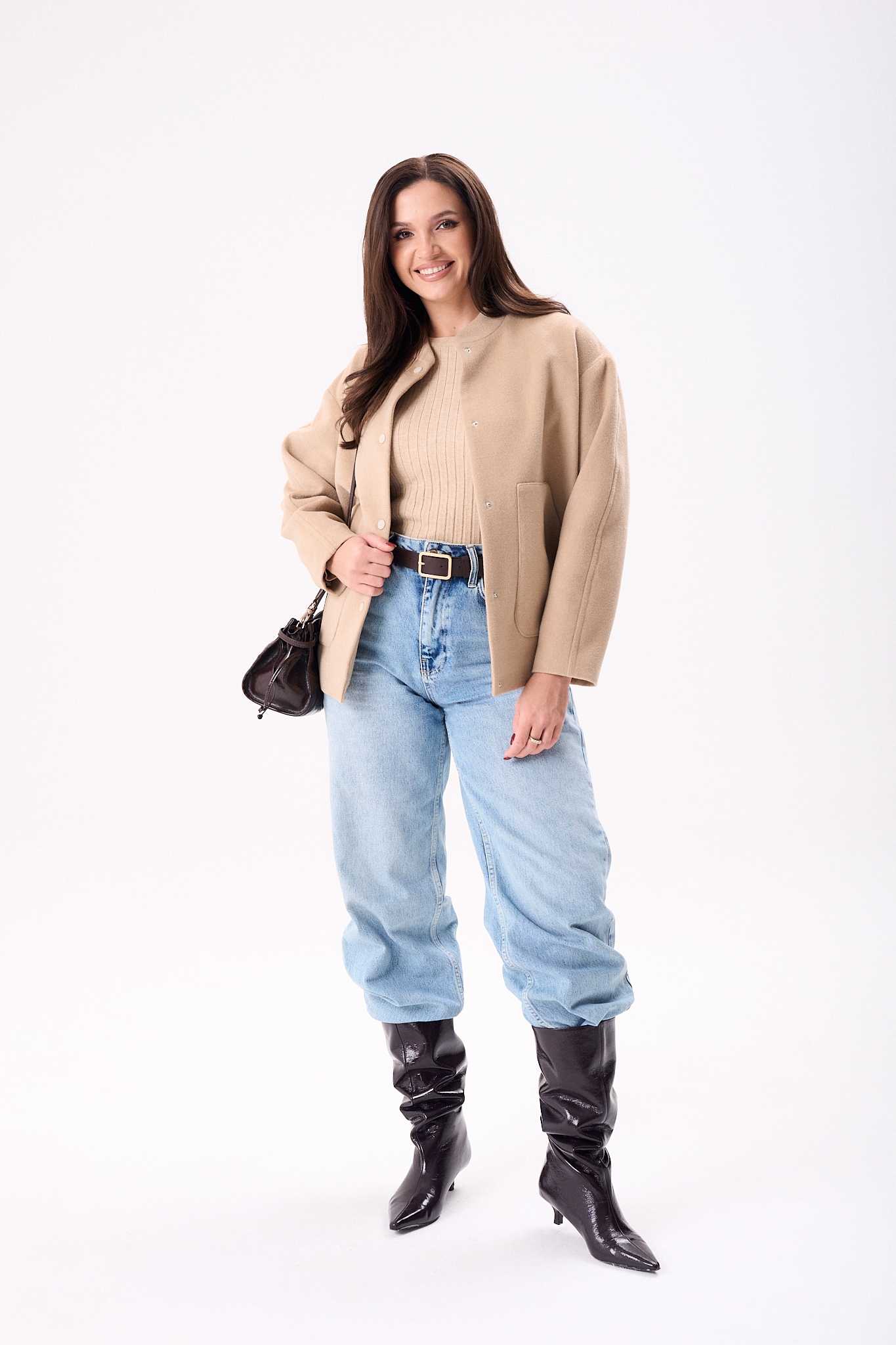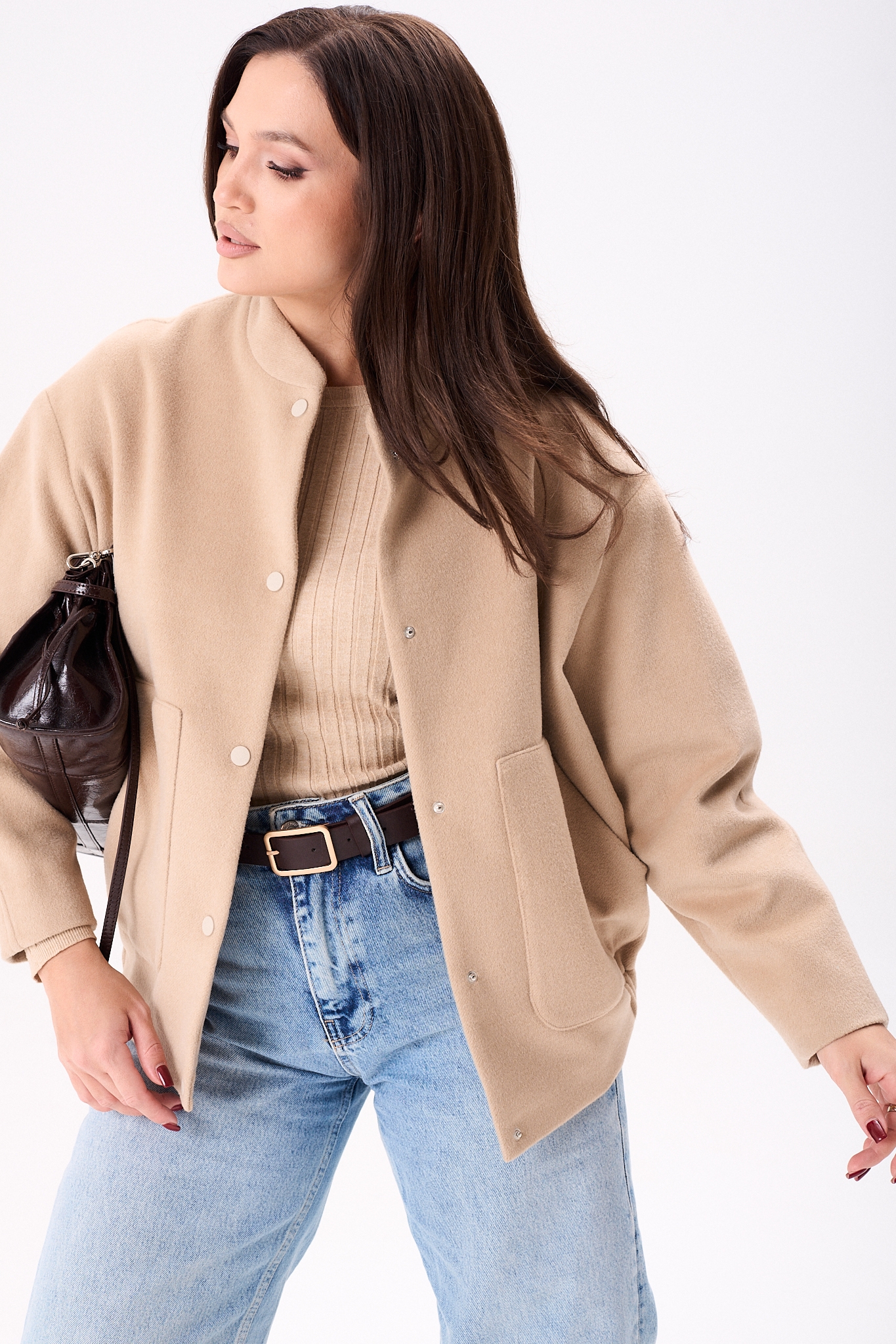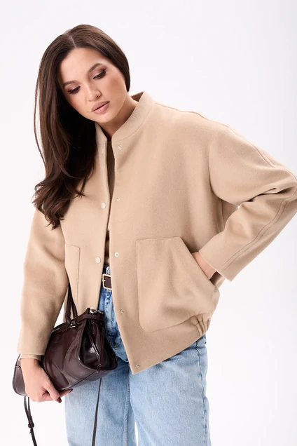 Женский жакет в пастельно-бежевом оттенке из мягкой пальтовой ткани, что гарантирует комфорт и универсальность использования. Дизайн данной модели включает воротник-стойку и спущенные рукава со втачным двухшовным исполнением. Жакет застёгивается на пробивные кнопки, что добавляет элегантности. Модель оснащена накладными карманами на передней части и подчеркнута эластичной резинкой по нижнему краю, создающей лёгкую сборку для акцентирования силуэта. Продукт выполнен на подкладке, обеспечивая дополнительный комфорт. Этот жакет станет идеальным выбором для создания стильных и практичных образов.