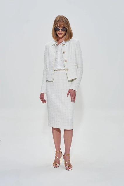 Жакет укороченной формы из жаккарда. Застежка на пуговицы с узором гербовой тематики. Изделие декорировано тесьмой. На подкладке.