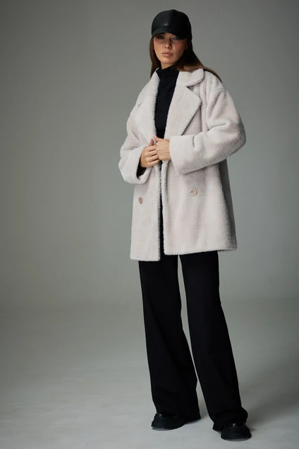 Жакет женский прямого силуэта с двубортной застежкой, покроя спущенное плечо. Выполнен из мехового трикотажного полотна, на подкладке. Горловина оформлена воротником пиджачного типа, с отрезной стойкой, рукав одношовный с цельнокроеной манжетой. В боковых швах расположены вертикальные карманы. Застежка на четыре пуговицы в цвет жакета. К данной модели прилагается пояс из основной ткани.