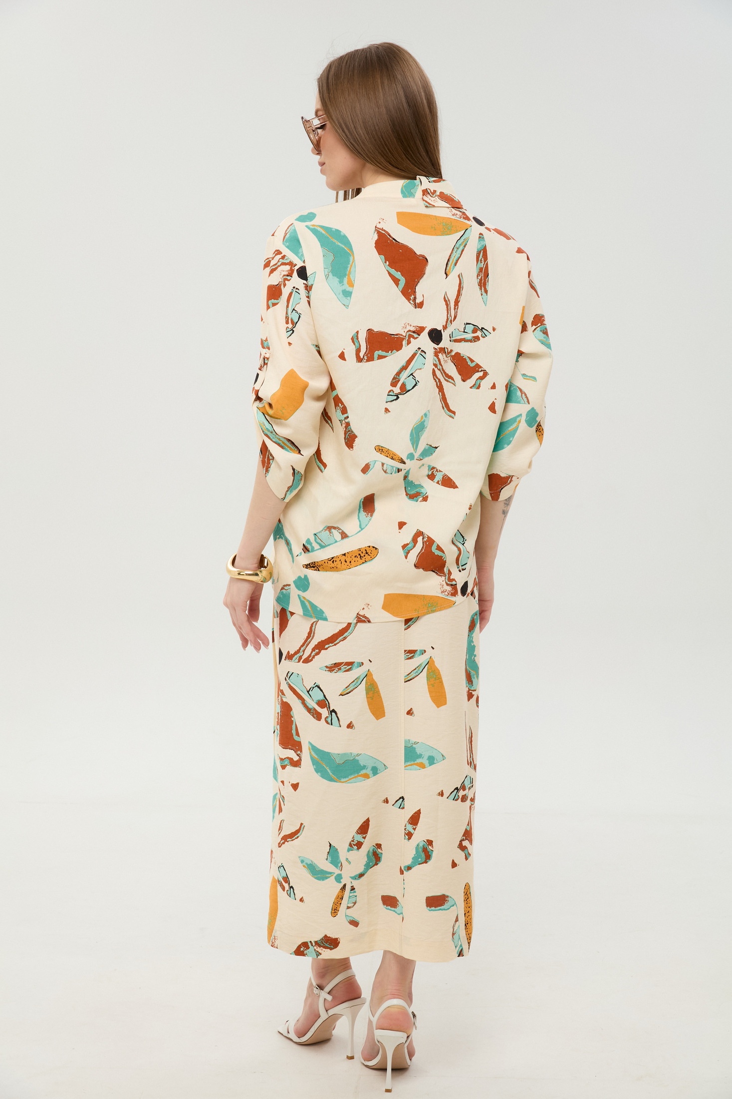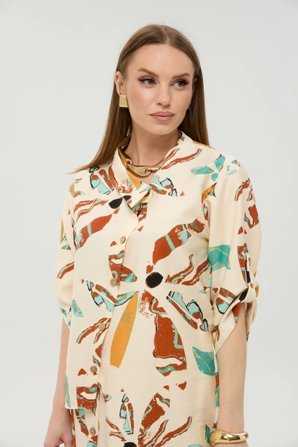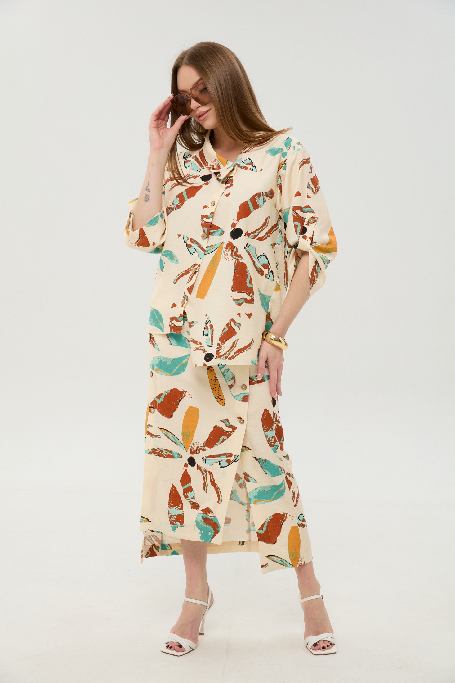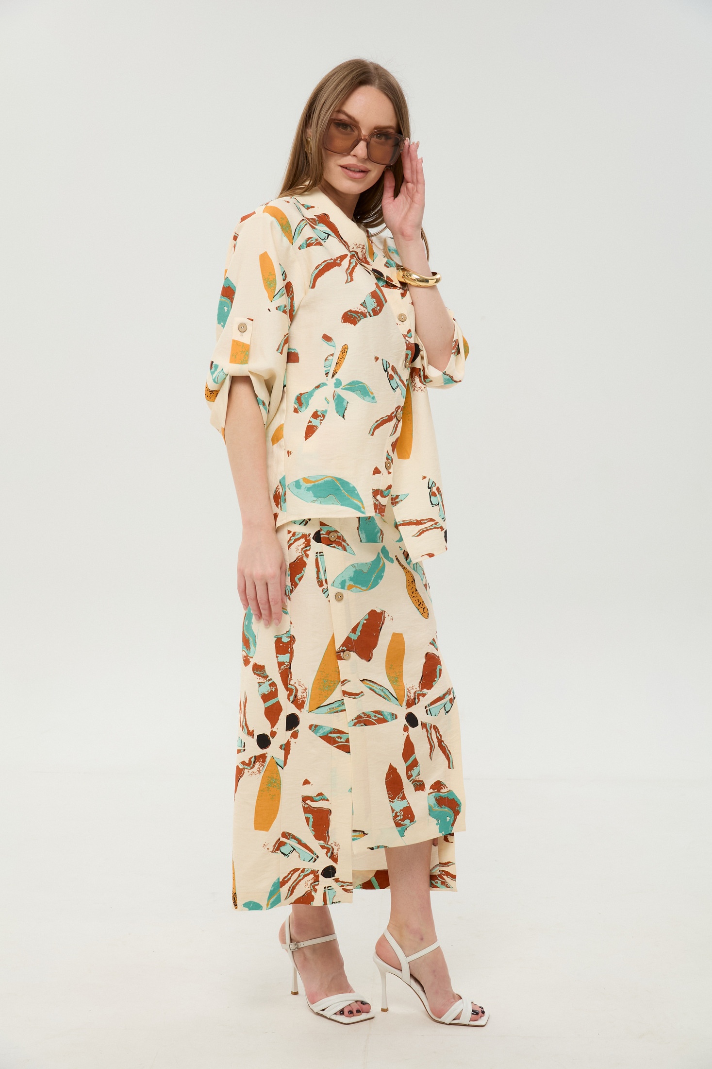Жакет 902-16 бохо мультиколор NikVa — это яркий элемент гардероба, идеальный для теплых сезонов. Коллекция бренда NikVa предлагает жакет рубашечного типа с асимметричным низом, что добавляет нотку необычности. Изготовленный из смеси льна, вискозы и хлопка, этот жакет обладает высокой воздухопроницаемостью и комфортом при ношении. Втачной рукав со спущенной линией плеча фиксируется на пату, предлагая расслабленный стиль. Смещенная застежка на пуговицы добавляет оригинальности, а отложной воротник на стойке завершает образ. Жакет отличается насыщенным мультиколорным принтом с элементами художественного абстракционизма, идеально подходящим для молодежного и повседневного гардероба.