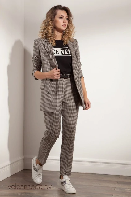 Стильный блейзер из костюмной поливискозной ткани с дизайном «гусиная лапка» прямого силуэта с двубортной застежкой на 4 пуговицы с отрезным бочком, с 3 карманами с клапанами по переду. Воротник пиджачного типа с отложными лацканами. Спинка со средним швом. Рукава втачные, длинные с открытыми шлицами по низу с застежкой на декоративные пуговицы. Изделие на поливискозной бежевой подкладке с контрастным кантом и отделочной строчкой.
