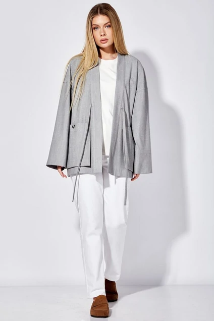 Жакет женский удлиненный в стиле кимоно из костюмной меланжевой ткани с притачной планкой по борту и горловине. В качестве застежки служат втачные завязки по планке. Спереди обработаны большые накладные-отлетные карманы, фиксируемые на петлю и пуговицу. Линия плеча спущена, рукава длинные широкие по низу с высокой подгибкой. Жакет без подкладки.