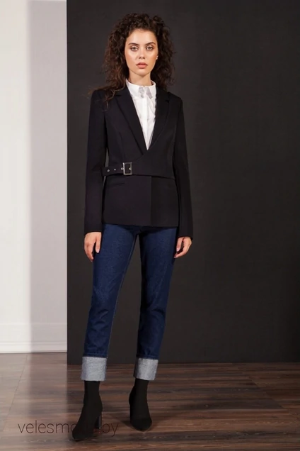 Женский удлинённый жакет из костюмной ткани прямого силуэта, застёгивающийся на одну петлю и пуговицу. Горловина обработана воротником и лацканами пиджачного типа . Рукава втачные двухшовные длинные с о шлицей по низу, застегивающиеся на петли и пуговицы. На полочках обработаны прорезные карманы врамку. Жакет на подкладке. Также с жакетом можно надевать жилет, выполненный из той же ткани на подкладке, застёгивающийся на металлическую пряжку сбоку.
