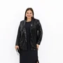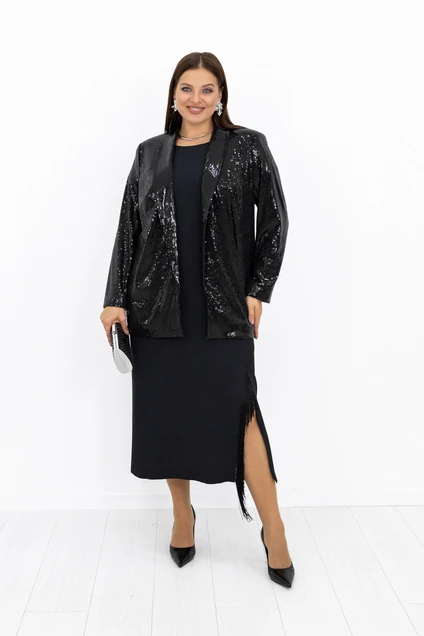 Жакет женский, нарядный, на подкладке. Силуэт прямой, без застёжки. Модель выполнена из трикотажного полотна с нашивными пайетками в тон. Воротник отложной, шалевый. От плечевого шва к центру груди вытачка. Рукав втачной, длинный. Спинка цельнокроеная. Жакет выполнен в минималистическом стиле, но благодаря яркой, активной фактуре, модель станет украшением любого торжества и гармонично дополнит современный праздничный образ.