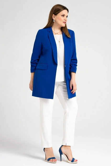 Стильный женский жакет для офиса и повседневной носки станет отличным дополнением к вашей коллекции красивых практичных вещей. Лаконичная модель замечательно комбинируется с брюками и джинсами, юбками и платьями. Она добавит в созданный вами образ эффектность и элегантность. Пиджак-жакет женский выглядит необычно. Его особенность- укороченный присобранный рукав 7/8 и застежка в виде потайного крючка. Воротник пиджачного типа с лацканами создает глубокий V-образный вырез. Жакет удлинённый женский приталенного покроя стройнит фигуру, благодаря рельефам по бокам, нагрудным вытачкам. Модель дополнена прорезными карманами, прикрытыми клапанами в рамку. Пиджак женский удлиненный пошит из эластичной, приятной на ощупь ткани с гладкой поверхностью. Подкладка изготовлена из натурального вискозного полотна. Жакет женский трикотажный не мнется, не деформируется после стирки, не теряет насыщенности цвета.