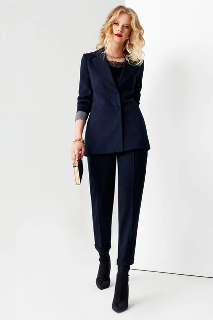 Очень стильный удлинённый жакет выполнен из плотного и приятного на ощупь ,эластичного трикотажного полотна. Рукав втачной длинный.Снизу обтачен подкладочной тканью с принтом в тонкую полосочку.Низ рукава можно отвернуть ,как манжет. Воротник отложной пиджачного типа. Застёжка спереди на одну петлю-пуговицу. Спереди выполнены прорезные карманы с листачкой. По спинке выполнен средний шов. Жакет без подкладки и максимально комфортен в эксплуатации. Идеально подходит как вариант на каждый день и в офис для предприимчивой и активной девушки,предпочитающей стильные и практичные вещи.