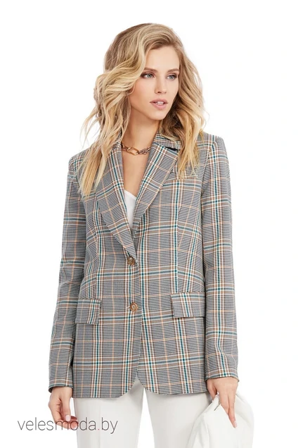 Жакет свободного покроя из текстильной ткани. Детали: полуприлегающий силуэт, пиджачный воротник, перед с функциональным нагрудным карманом и двумя прорезными карманами с клапанами, застежка на две петли и пуговицы, спинка со средним швом, талевые вытачки, рукава втачные двухшовные, жакет на подкладке