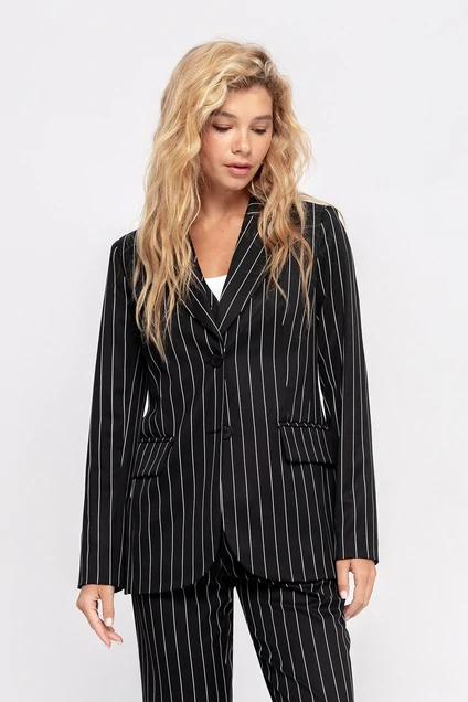 Детали: полуприлегающий силуэт, талиевые вытачки, пиджачный воротник, застежка на две петли и пуговицы, функциональные карманы, рукава и спинка со шлицами, жакет на подкладке из 100% вискозы