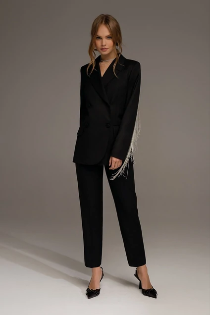Двубортный жакет прямого силуэта с отделкой в виде металлической бахромы. Детали: пиджачный воротник, прорезные карманы с клапанами, спинка со средним швом, втачные двухшовные рукава, жакет на подкладке
