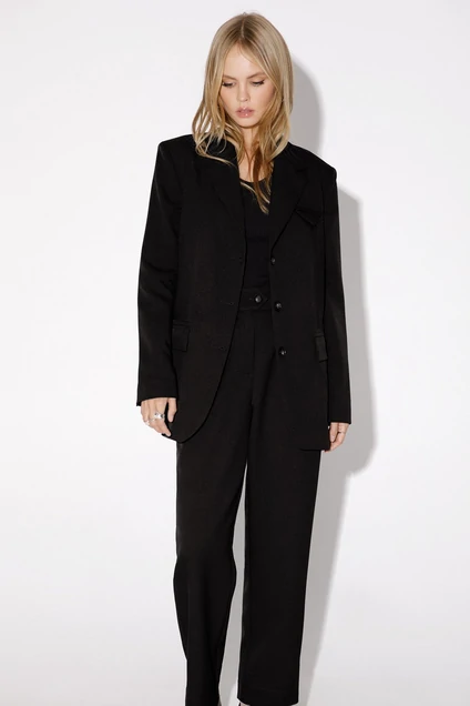 Свободный жакет с разрезами по низу рукавов. Детали: жакет прямого силуэта, пиджачный воротник, перед с прорезными функциональными карманами, нагрудный декоративный карман, однобортная застежка на петли и пуговицы, спинка со средним швом, рукава втачные двухшовные с разрезами по низу, жакет на подкладке.