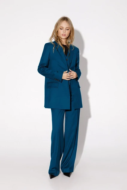 Текстильный жакет трапециевидного силуэта с высокой шлицей по спинке. Детали: свободный покрой, пиджачный воротник, талиевые вытачки, функциональный нагрудный карман, прорезные карманы с клапанами, застежка на пуговицы, спинка со средним швом и высокой шлицей, рукава втачные двухшовные, жакет на подкладке.
