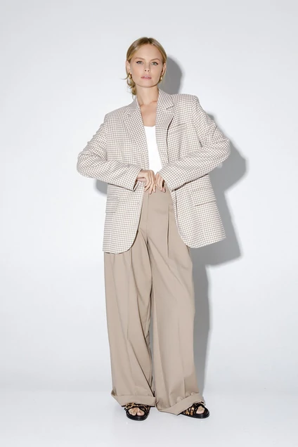 Оверсайз жакет из текстильной ткани с рисунком «гусиная лапка». Детали: жакет прямого силуэта, расширенная линия плеч, пиджачный воротник, перед с прорезными функциональными карманами, однобортная застежка на петли и пуговицы, спинка со средним швом и шлицей, рукава втачные двухшовные, на подкладке.