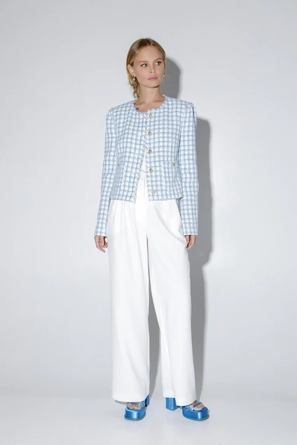 Укороченный жакет из фактурной ткани в клетку. Детали: жакет полуприлегающего силуэта, рельефы, круглая горловина, без воротника, рукава втачные со складками по окату, функциональные карманы, застежка на петли и пуговицы, на подкладке. Длина по спинке около 48 см в размерах 40-46 и около 51 см в размерах 48-52, длина рукава около 65 см. подкладка- 55% вискоза 45% полиэстер