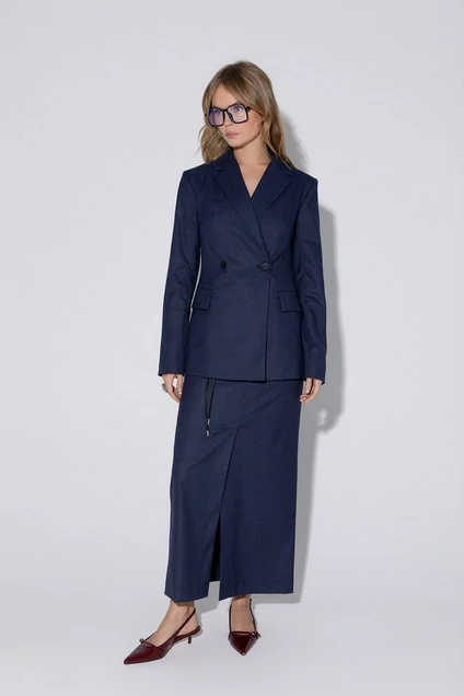Приталенный двубортный жакет из текстильной ткани в тонкую полоску.