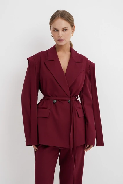 Детали: жакет свободного покроя и полуприлегающего силуэта, двубортная застежка на петли и пуговицы, отрезные бочки, пиджачный воротник, функциональные карманы, жакет на подкладке, съемный пояс.