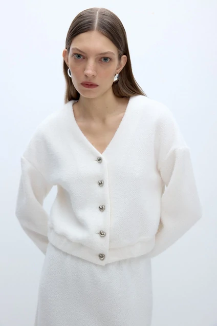 Пушистый укороченный бомбер с декоративными пуговицами.