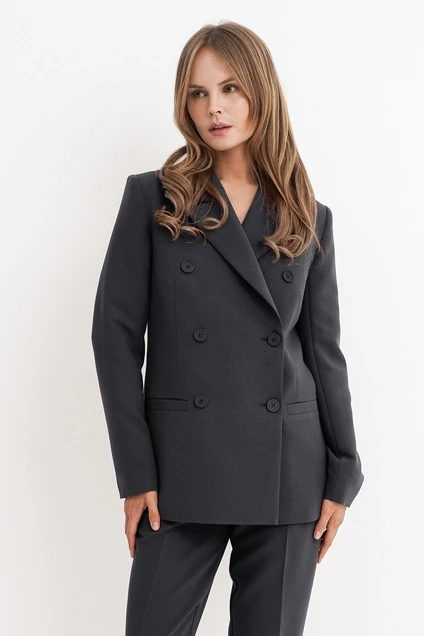 Детали: жакет прямого силуэта, пиджачный воротник, перед с прорезными карманами, застежка на петли и пуговицы, спинка со средним швом, рукава втачные двухшовные, жакет на подкладке.
