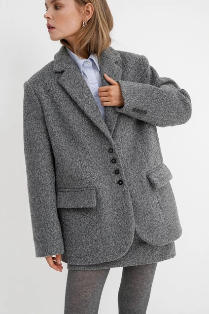 Детали: жакет прямого силуэта, расширенная линия плеч, пиджачный воротник, перед с прорезными функциональными карманами, однобортная застежка на петли и пуговицы, спинка со средним швом и шлицей, рукава втачные двухшовные, жакет на подкладке.