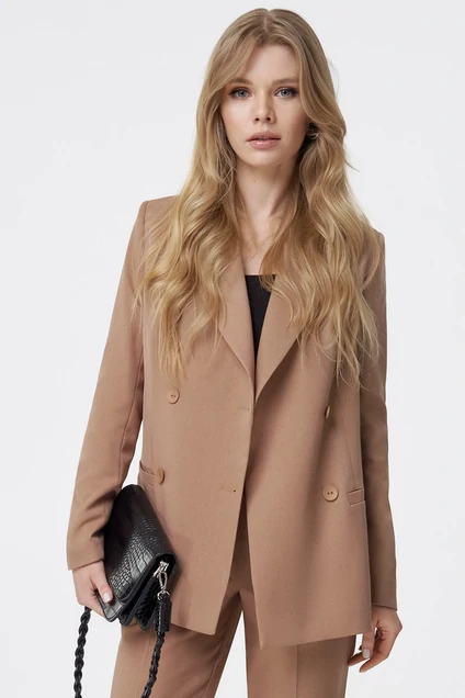 Двубортный блейзер «мужского» покроя из текстильной ткани. Детали: прямой силуэт, пиджачный воротник, прорезные карманы, спинка со средним швом, втачные двухшовные рукава Дл. спинки около 65/69см; дл. рукава около 60см