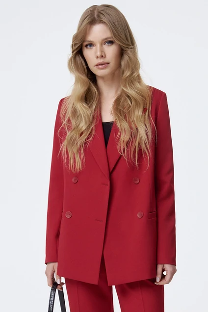 Двубортный блейзер «мужского» покроя из текстильной ткани. Детали: прямой силуэт, пиджачный воротник, прорезные карманы, спинка со средним швом, втачные двухшовные рукава Дл. спинки около 65/69см; дл. рукава около 60см