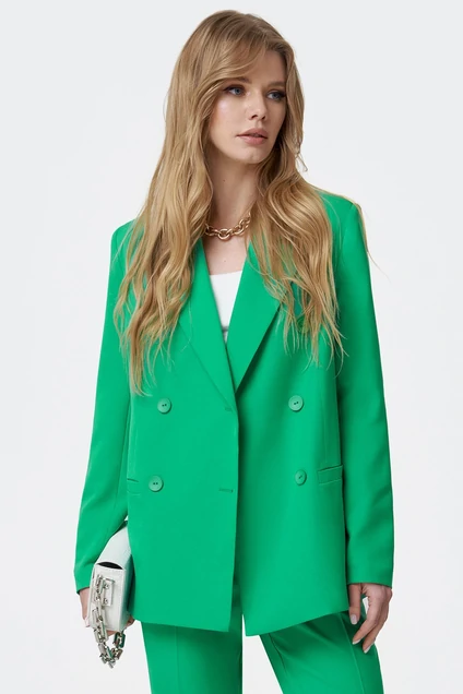 Двубортный блейзер «мужского» покроя из текстильной ткани. Детали: прямой силуэт, пиджачный воротник, прорезные карманы, спинка со средним швом, втачные двухшовные рукава Дл. спинки около 65/69см; дл. рукава около 60см