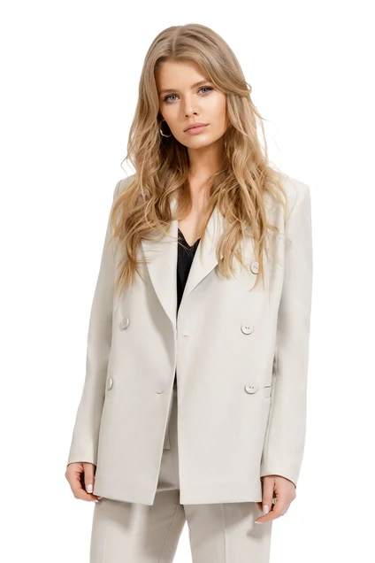 Двубортный блейзер «мужского» покроя из текстильной ткани. Детали: прямой силуэт, пиджачный воротник, прорезные карманы, спинка со средним швом, втачные двухшовные рукава Дл. спинки около 65/69см; дл. рукава около 60см