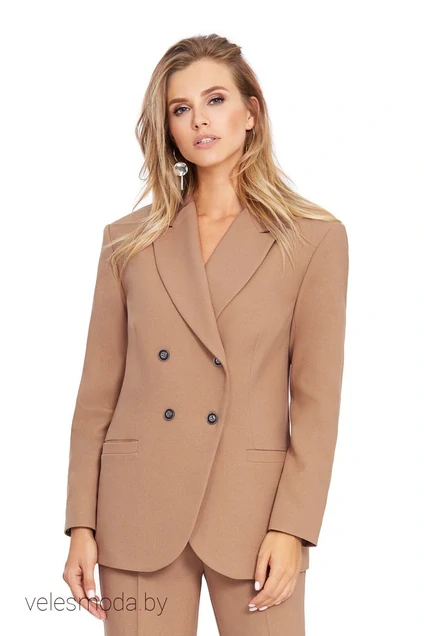 Текстильный жакет свободного покроя с широкими плечами в стиле 80-х. Детали: двубортная застежка, пиджачный воротник, талевые вытачки по переду и спинке, прорезные карманы с листочкой, длинные втачные рукава, жакет на подкладке