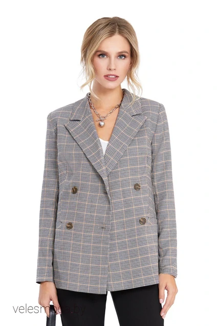 Двубортный жакет «мужского» покроя из текстильной ткани в клетку. Детали: прямой силуэт, пиджачный воротник, прорезные карманы, средний шов по спинке, втачные двухшовные рукава, на подкладке