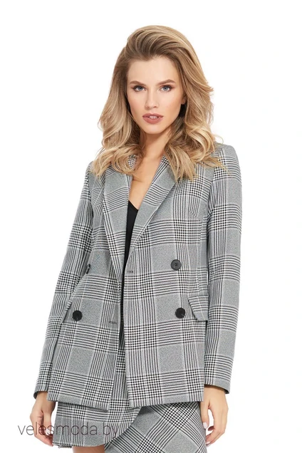 Двубортный приталенный жакет из текстильной ткани в клетку.