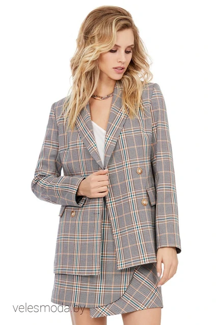 Двубортный приталенный жакет из текстильной ткани в клетку.