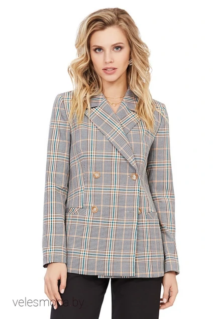 Двубортный жакет «мужского» покроя из текстильной ткани в клетку. Детали: полуприлегающий силуэт, пиджачный воротник, прорезные карманы, средний шов по спинке, втачные двухшовные рукава, жакет на подкладке
