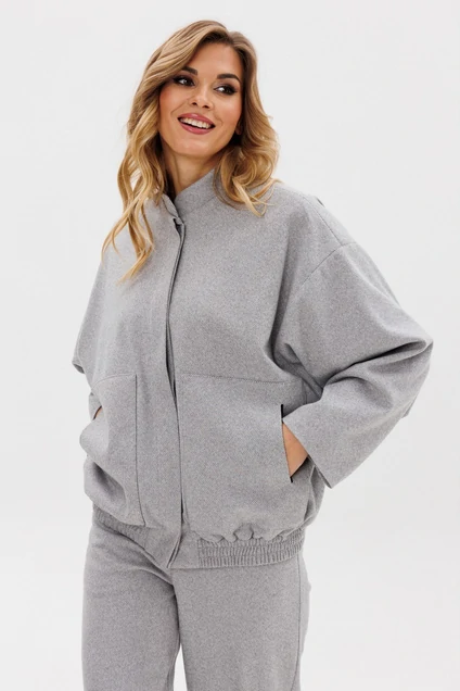 Жакет женский-бомбер на подкладке из трикотажной ткани. По переду расположены накладные карманы. Спущенное плечо. Низ изделия на резинке. Застежка на потайной планке. Горловина оформлена стойкой.