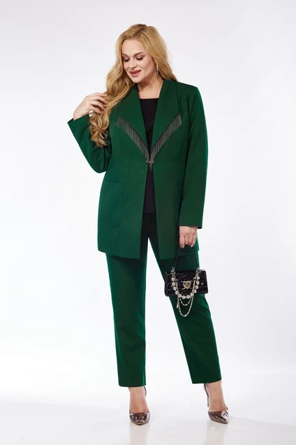 Удлинённый жакет полуприлегающего силуэта с шалевым фигурным воротником и отделочной тесьмой. На деталях переда и спинки обработаны рельефы, накладные карманы, сзади средний шов с высокой шлицей. Рукава втачные двухшовные. Застёжка в стык на декоративную фурнитуру. Шлица с отделкой из пуговиц. Изделие на подкладке и с плечевыми накладками.