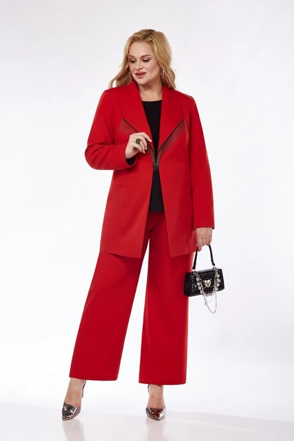 Удлинённый жакет полуприлегающего силуэта с шалевым фигурным воротником и отделочной тесьмой. На деталях переда и спинки обработаны рельефы, накладные карманы, сзади средний шов с высокой шлицей. Рукава втачные двухшовные. Застёжка в стык на декоративную фурнитуру. Шлица с отделкой из пуговиц. Изделие на подкладке и с плечевыми накладками.