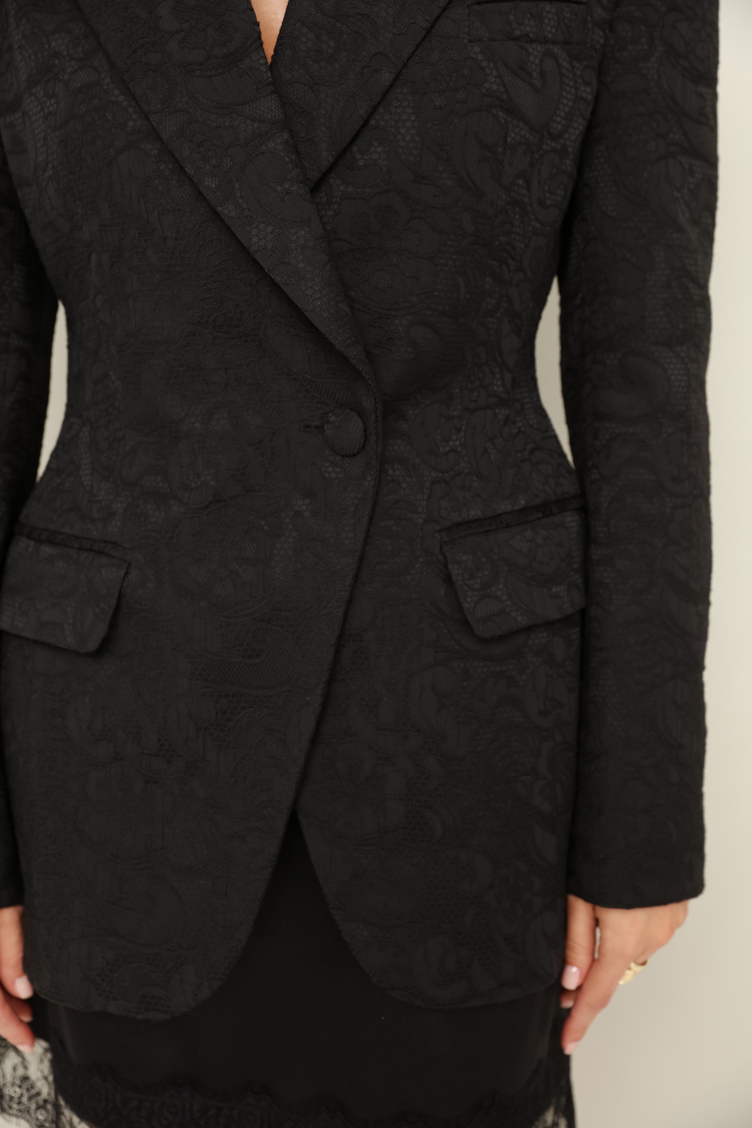 Силуэтный жакет с подчеркнутой линией талии, выполнен из жаккарда. Смещенная застежка на петлю и обтяжную пуговицу. Воротник пиджачного типа с отложными лацканами, край борта скругленный по низу жакета. Спереди обработаны прорезные карманы в рамку с клапанами и нагрудный прорезной карман с листочкой. Рукава втачные, двухшовные с отлетнымм шлицами. Спинка с рельефами и средним швом, переходящим в шлицу. Жакет на подкладке.