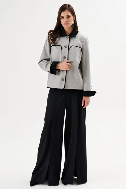 Жакет свободного кроя, длиной до линии бедер. По спинке средний шов. По переду нагрудные вытачки, в области груди настрочены накладные карманы. Рукава длинные, двушовные, втачные, по низу с притачной манжетой. В локтевом шве, обработана открытая шлица, на которой пробиты петли и пришиты пуговицы. Воротник стояче-отложной. Застежка центральная бортовая на петли и пуговицы. Край борта, низ жакета, верхний срез кармана, шлица в рукаве, обработан кантом из отделочной ткани. Воротник и манжеты выполнены из отделочной ткани. Жакет на подкладке.