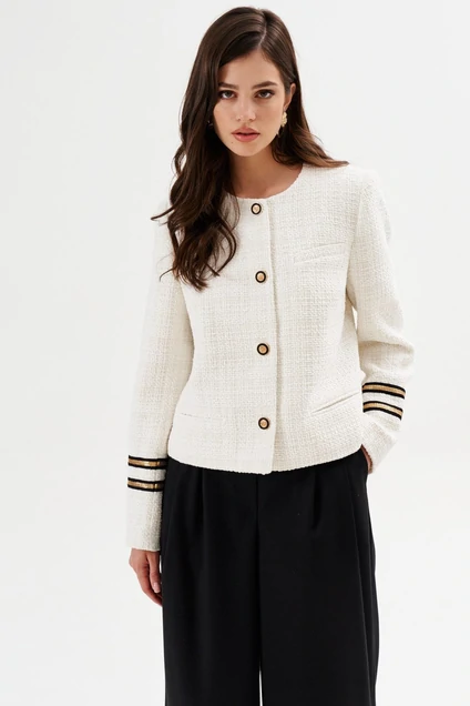 Жакет прямого силуэта, длиной выше линии бедер. По спинке средний шов. По переду нагрудные вытачки, прорезные карманы «в рамку». На левом переде, в области груди обработан карман-обманка с листочкой. Рукава длинные, двушовные, втачные, по низу декорированы отделочной тесьмой. В локтевом шве есть шлица, а которой пришиты пуговицы. Горловина округлой формы, без воротника. Застежка на петли и пуговицы. Жакет на подкладке.