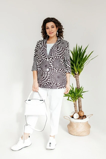 Жакет прямого силуэта, длиной ниже линии бедер на 6см. Перед с двумя талиевыми вытачками, выходящими из низа, с двумя накладными карманами с закругленными концами. Спинка со средним швом. Горловина с V-образным вырезом с втачными воротником пиджачного типа с отложным лацканом. Застежка центральная, бортовая, на 2 пришивные пуговицы. Рукав втачной, двух шовный, длиной 3\4. Жакет на подкладке, с плечевыми накладками. Длина спинки 66 см, длина рукава 49 см.