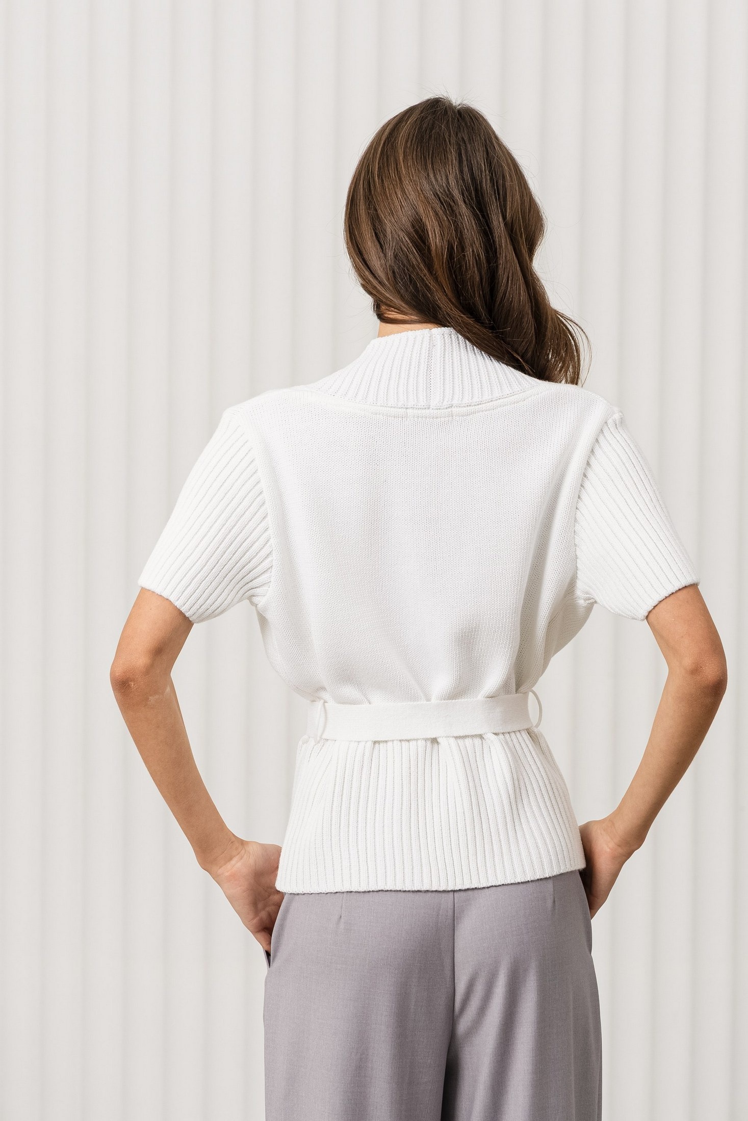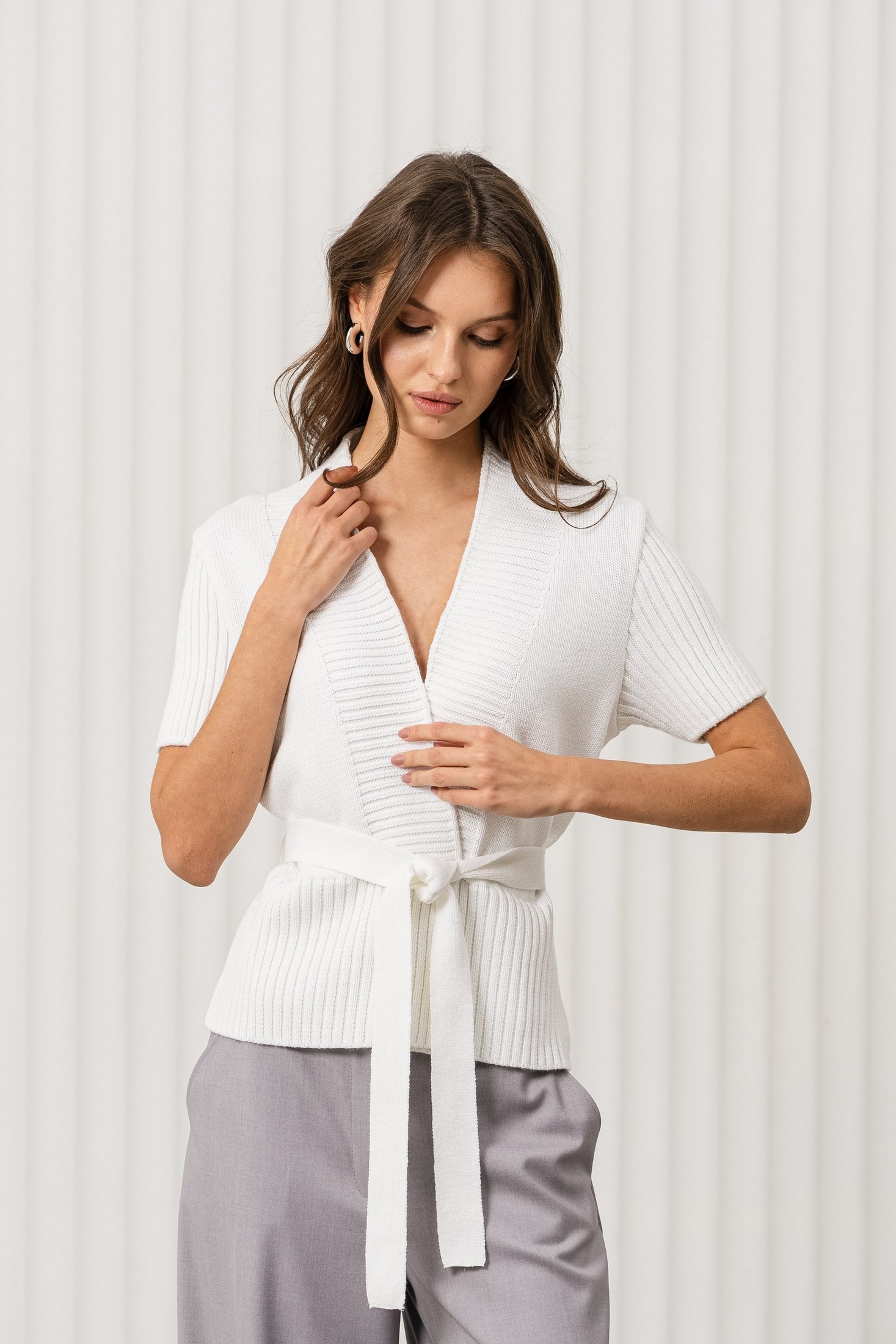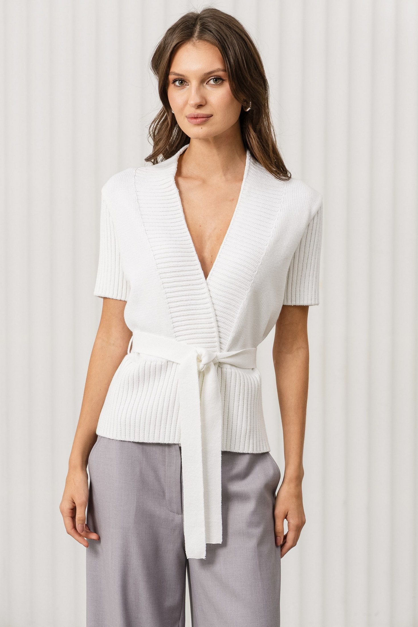 Дизайн: топ с V-образным вырезом и короткими рукавами. Ребристая текстура и завязка на поясе придают изделию оригинальность и женственность, подчёркивая фигуру;