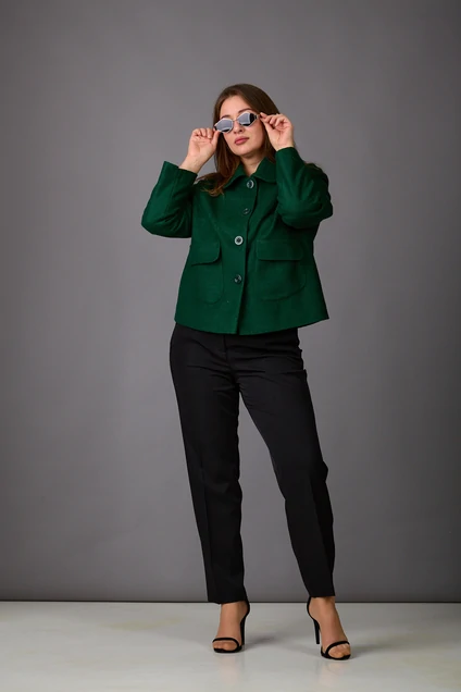 Жакет на подкладке из пальтовой ткани. Силуэт прямой, по переду нагрудные вытачки и накладные карманы с клапанами округлой формы. Пройма спущена, рукава узкие. Воротник с закругленными углами с притачной стойкой. Застегивается на 4 пуговицы.
