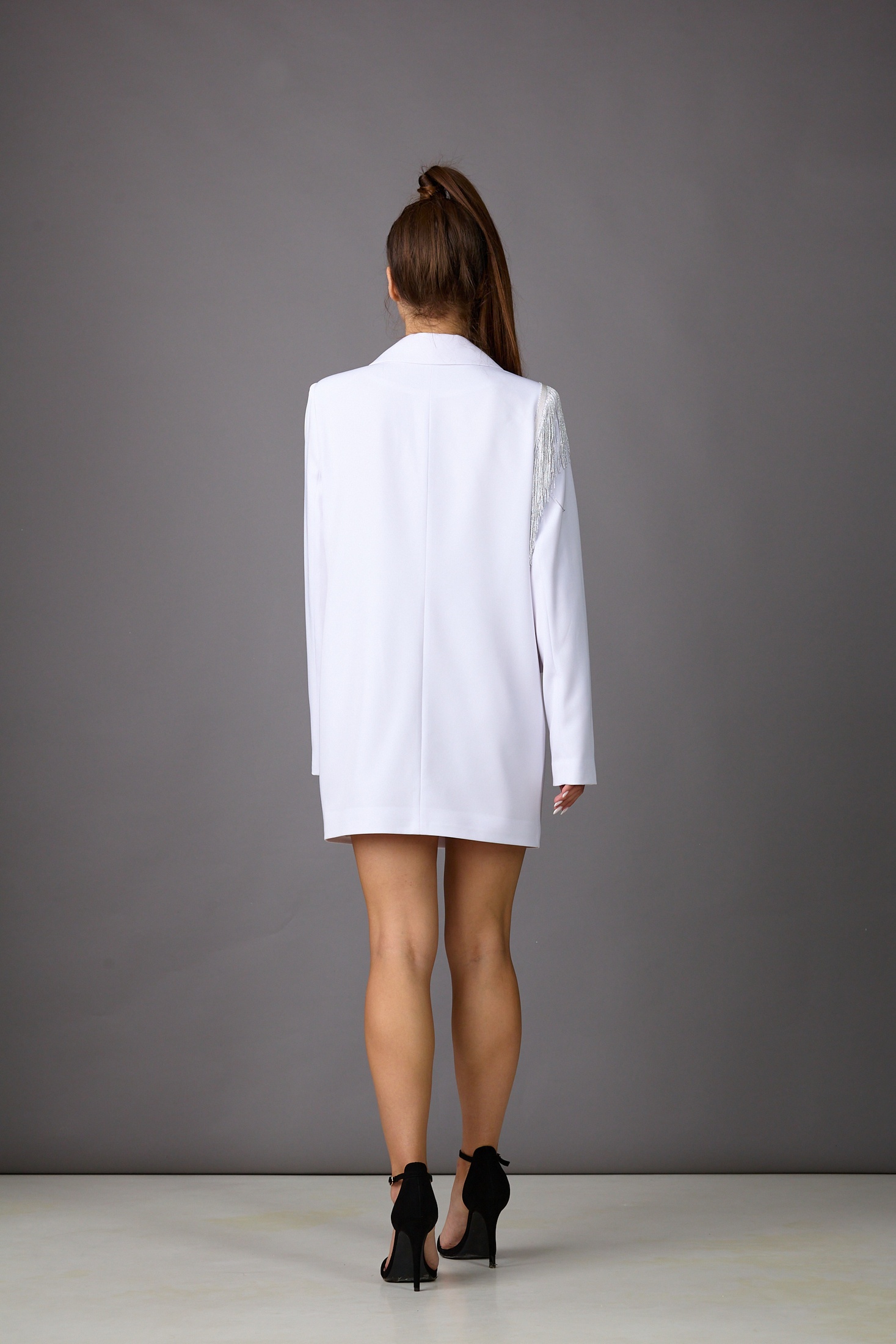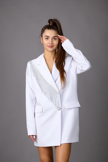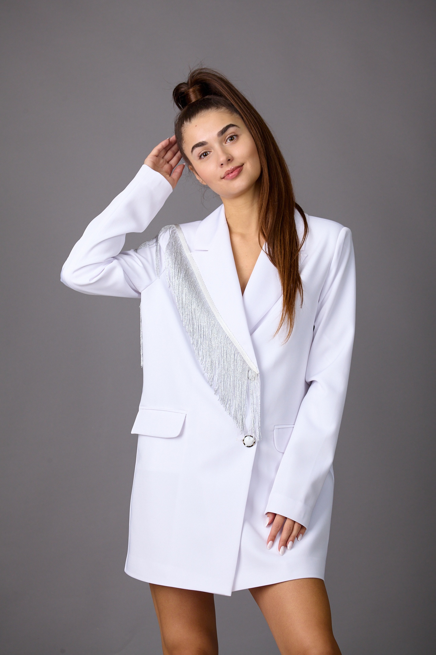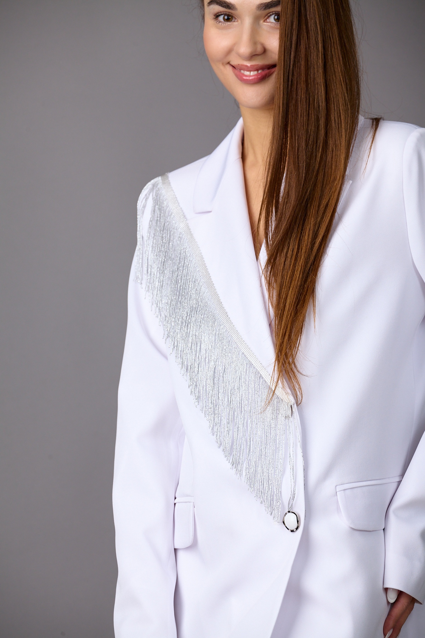Представляем жакет женский из костюмной ткани на подкладке, который станет незаменимым спутником в вашей жизни. Лаконичный прямой силуэт жакета с двубортной застежкой прекрасно сочетается с бахромой по лацкану, переходящей на плечо и спинку. По переду- прорезные карманы с клапанами. Воротник-с отложными лацканами пиджачного типа. Рукава двухшовные, длинные. Жакет можно носить в сочетании с платьями- комбинациями, юбками, брюками. Позвольте себе быть разной: дерзкой,нежной и невероятно стильной с нашим жакетом! Длина жакета 44-48р - 82см , 50-54р- 84см