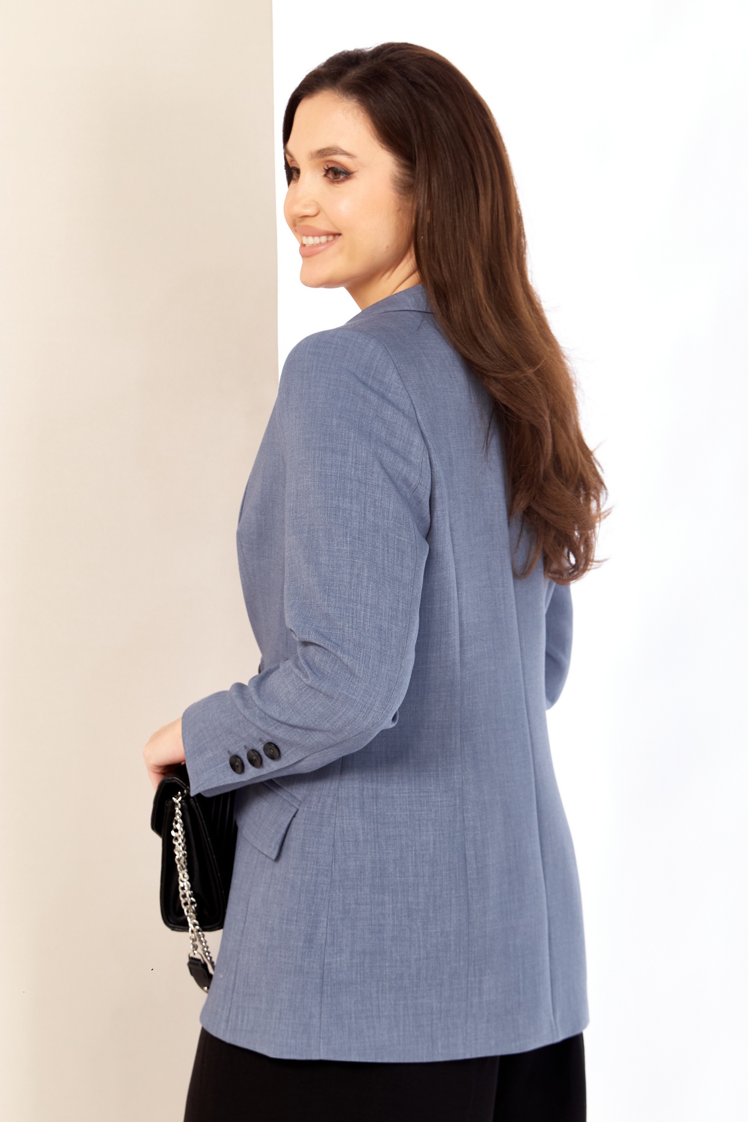 Эффектный жакет из текстильной ткани станет отличным дополнением вашего гардероба. Жакет женский удлиненный, полуприлегающего силуэта с центральной бортовой застежкой на пуговицу, на подкладке. Перед жакета с боковыми рельефными швами от проймы до низа изделия. Воротник отложной пиджачного типа. Перед с прорезными карманами и клапаном. Рукав длинный, втачной, двух шовный. По низу рукава шлица и потайная застежка-обманка на 3 пуговицы. Спинка с боковыми рельефными швами от линии проймы до линии низа и со средним швом.
