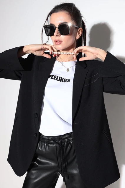 Стильный женский жакет современного прямого силуэта, с цельнокроеными бочками, на подкладке. Воротник пиджачного типа с отложным лацканом. Спереди прорезные карманы в рамку, на левой стороне полочки жакета вышивка контрастными нитками, имитирующая листочку. Спинка со средним швом и высокой отлетной шлицей ( 38 см ). Рукав втачной, двухшовный, по переднему шву с открытой шлицей. Универсальный, лаконичный жакет, станет идеальным дополнением множества деловых, повседневных и вечерних образов. Длина жакета по среднему шву спинки 77 см. Длина рукава 62 см. Футболка с дизайнерским принтом S-7101 Стильные брюки из эко-кожи S-3105