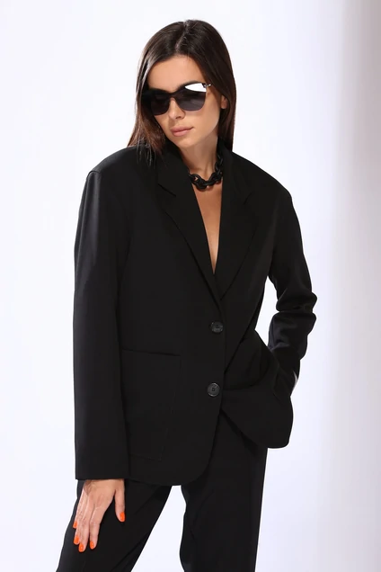 Стильный женский жакет современного прямого силуэта, с цельнокроеными бочками, на подкладке. Линия плеча слегка спущена, рукав прямой, двухшовный. На левом рукаве настрочена декоративная бирка. Воротник пиджачного типа с отложным лацканом. По переду с двух сторон крупные накладные карманы. Застежка жакета на двух пуговицах, жакет смотрится очень стильно и лаконично. Универсальный жакет создаст десятки новых стильных комбинаций и станет отличной долгосрочной инвестицией. Длина жакета по среднему шву спинки 68 см. Длина рукава от спущенного плеча 59 см.