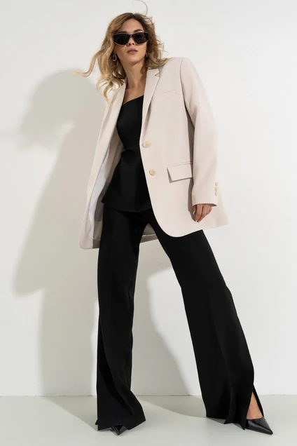 Универсальный, трендовый жакет в роскошном цвете "экрю", свободного силуэта, с цельнокроеными бочками, на подкладке. Воротник пиджачного типа с отложным лацканом, на левой полочке листочка. Спереди прорезные карманы в рамку с клапаном. Спинка со средним швом и высокой отлетной шлицей (40 см.). Рукав втачной , двухшовный, со шлицей и пуговицами. Жакет создаст десятки новых стильных комбинаций и станет отличной долгосрочной инвестицией. Длина жакета по среднему шву спинки 77 см. Длина рукава 62 см.
