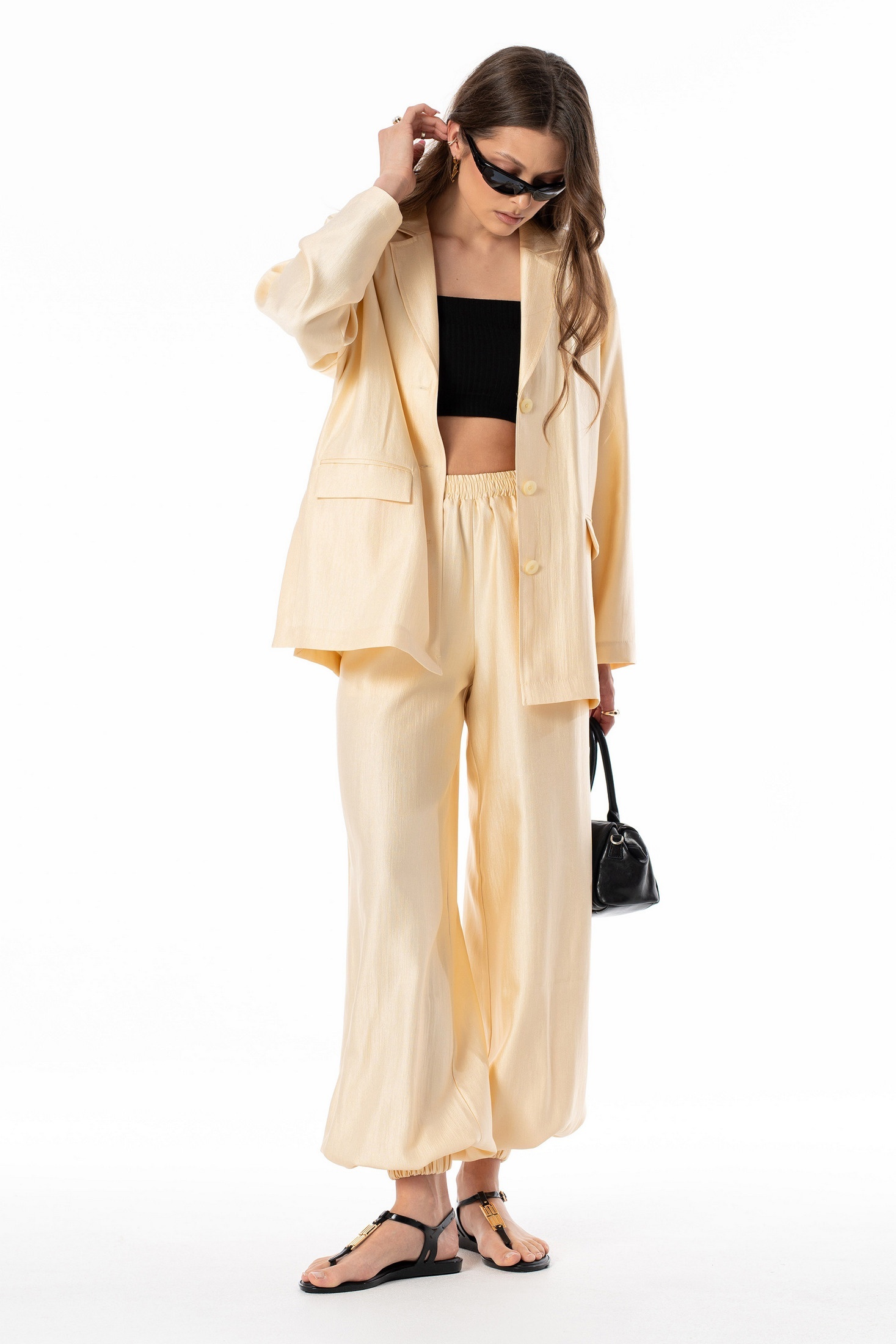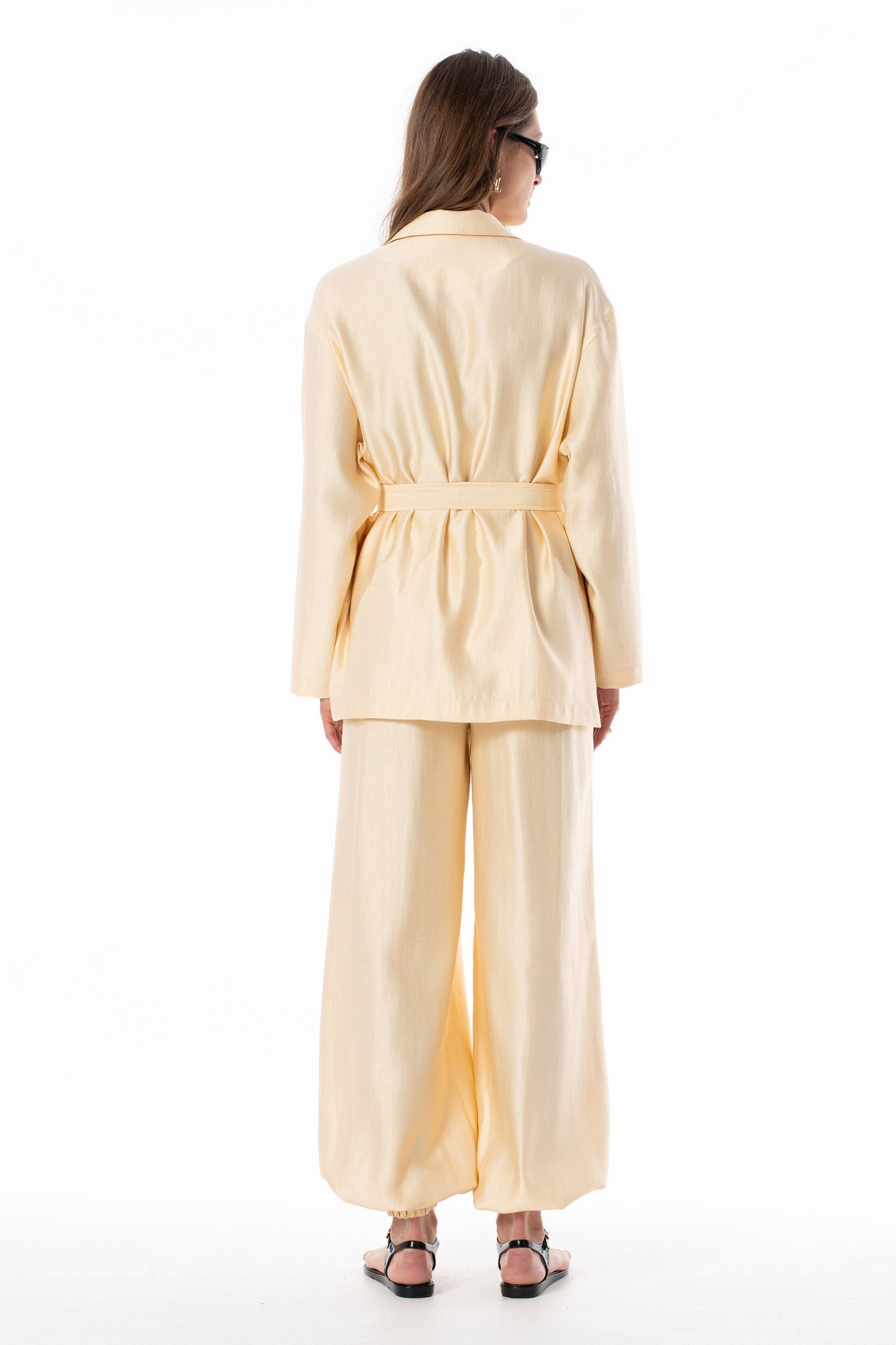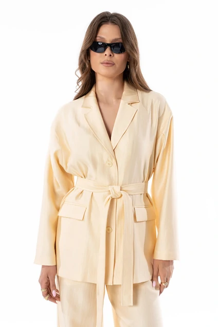 Стильный жакет без подкладки, свободного, прямого силуэта. Спереди прорезные карманы с клапаном. Рукав на спущенной пройме. В боковых швах разрезы. Воротник пиджачного типа. В комплект входит пояс - завязка из основной ткани. Изделие великолепно вписывается как в формальный деловой гардероб, так и в стильный образ для прогулок по городу. Длина жакета по спинке 72 см. Длина рукава от горловины 73 см.