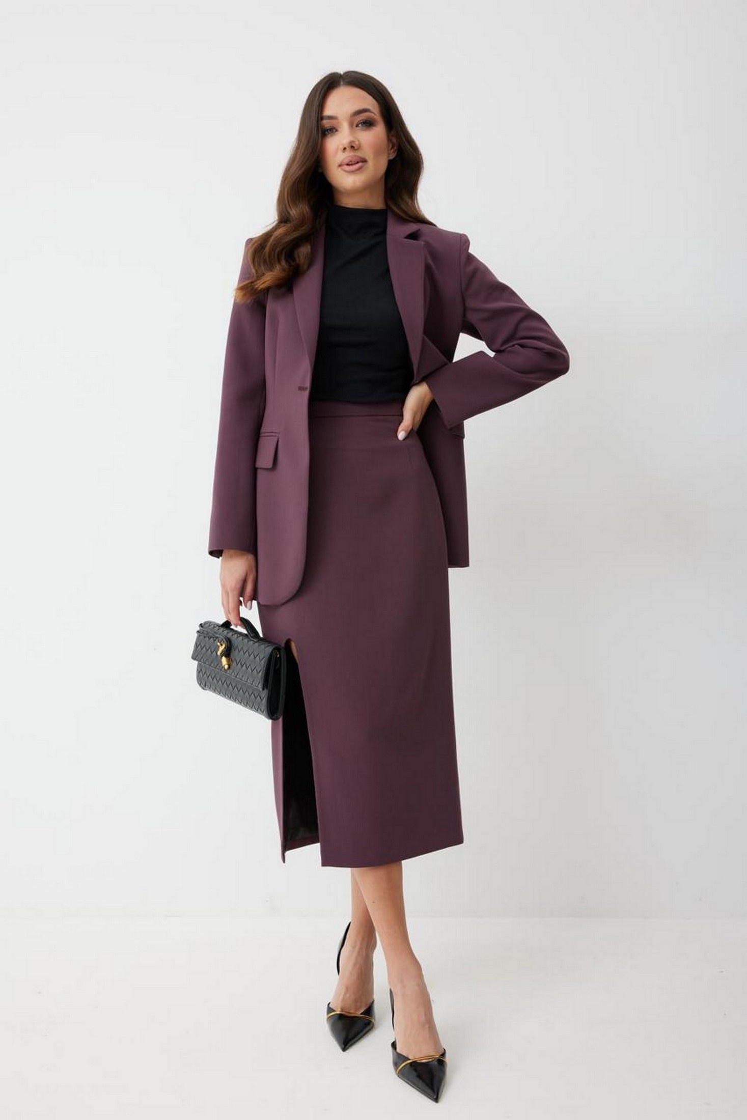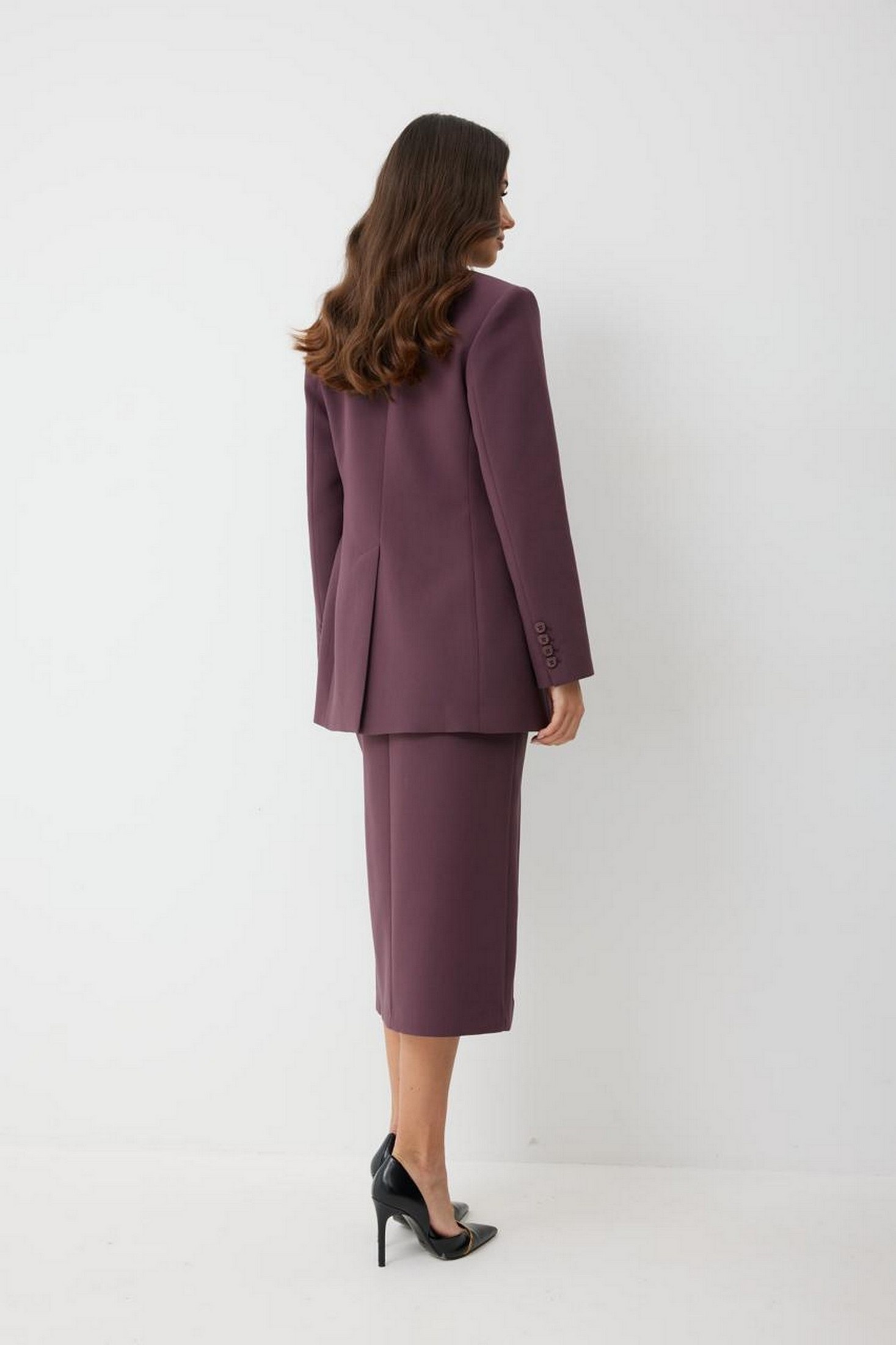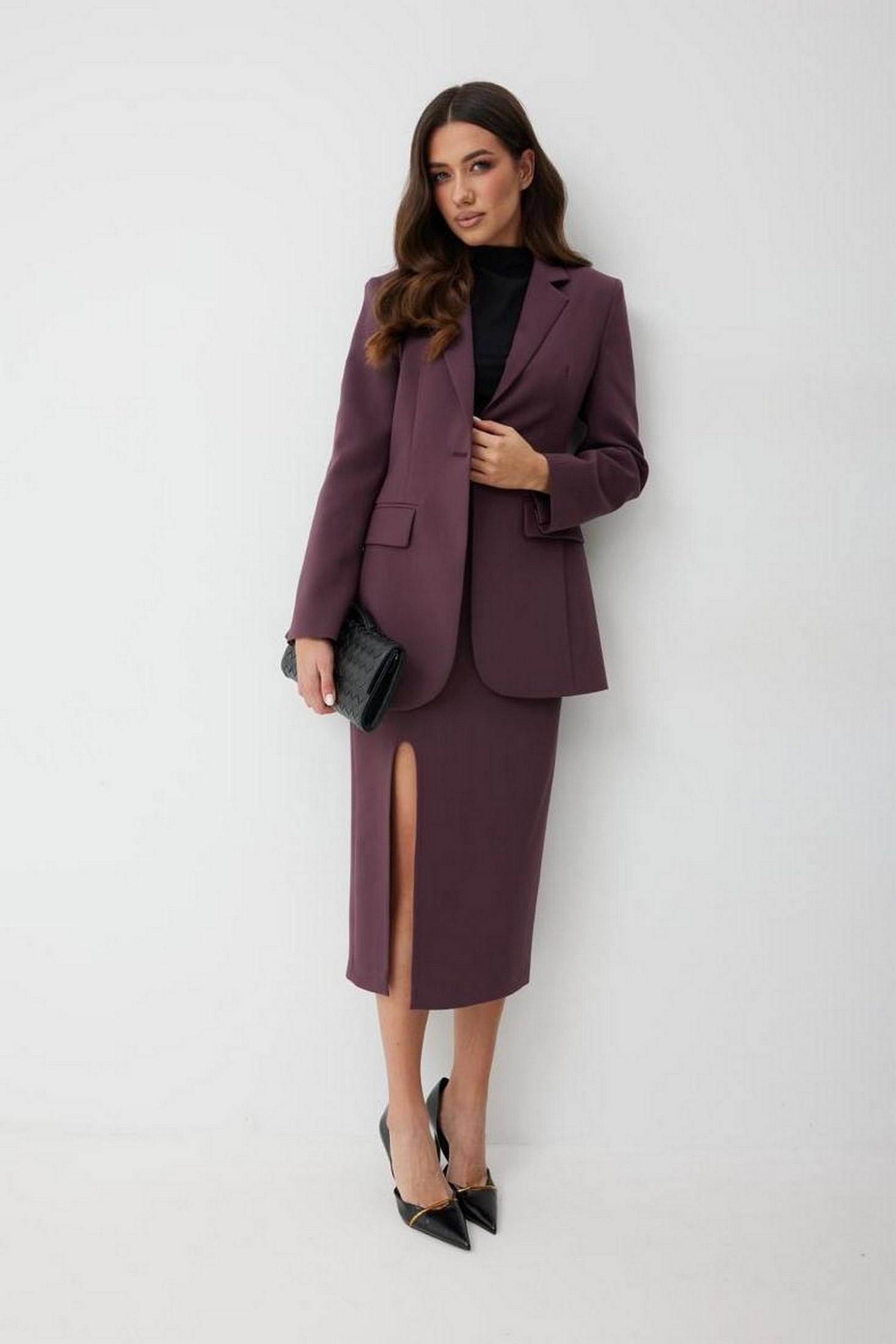 Центральная однобортная застежка на одну петлю и пуговицу придает лаконичность. Классический пиджачный воротник с лацканами и изящный V-образный вырез создают строгий, женственный образ. По полочке функциональные прорезные карманы с клапанами. Рукава втачные длинные, двух шовные, со шлицей и застежкой на пуговицы снизу. Спинка жакета со средним швом, внизу которого шлица. Этот жакет безупречно сочетается с юбкой М371.