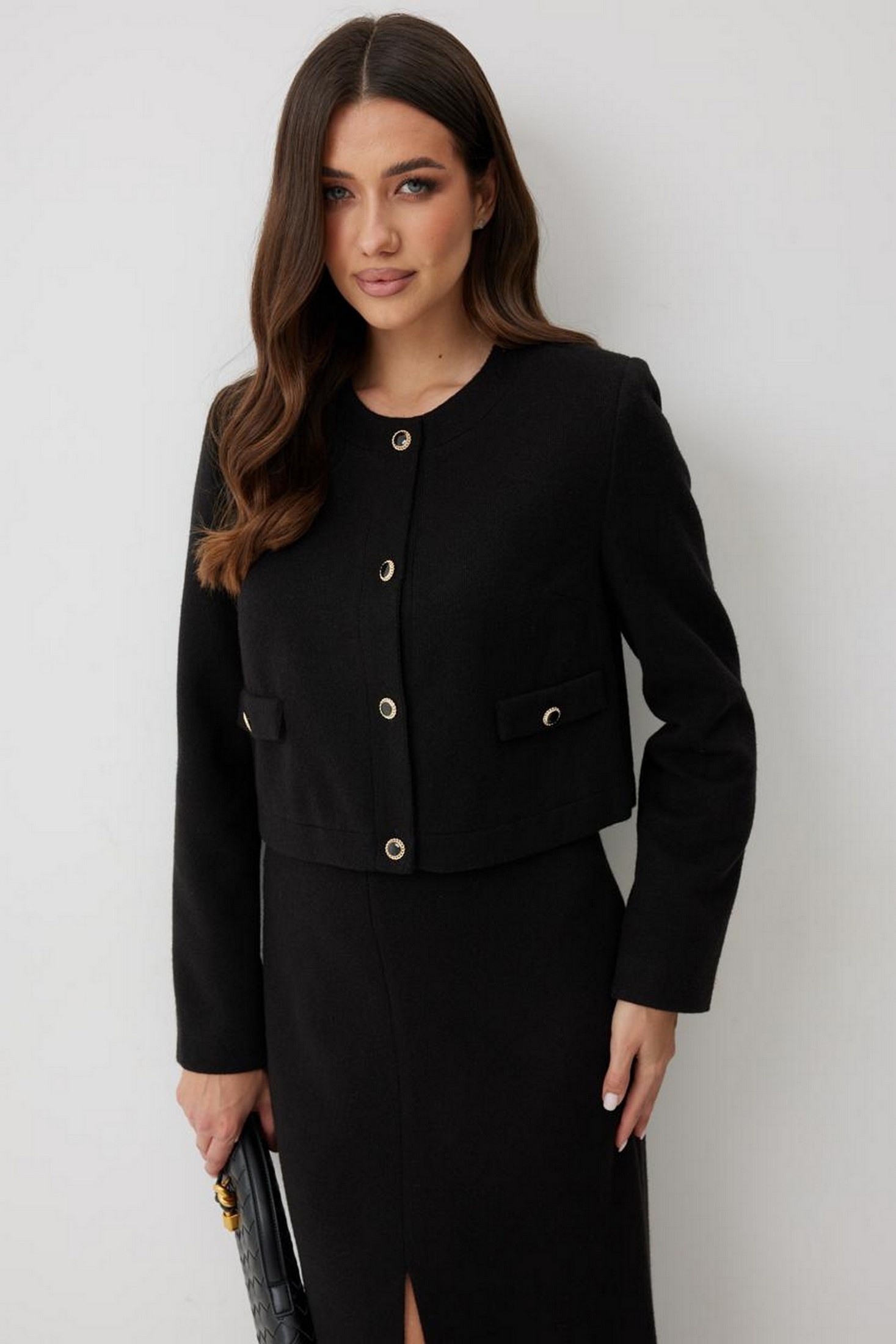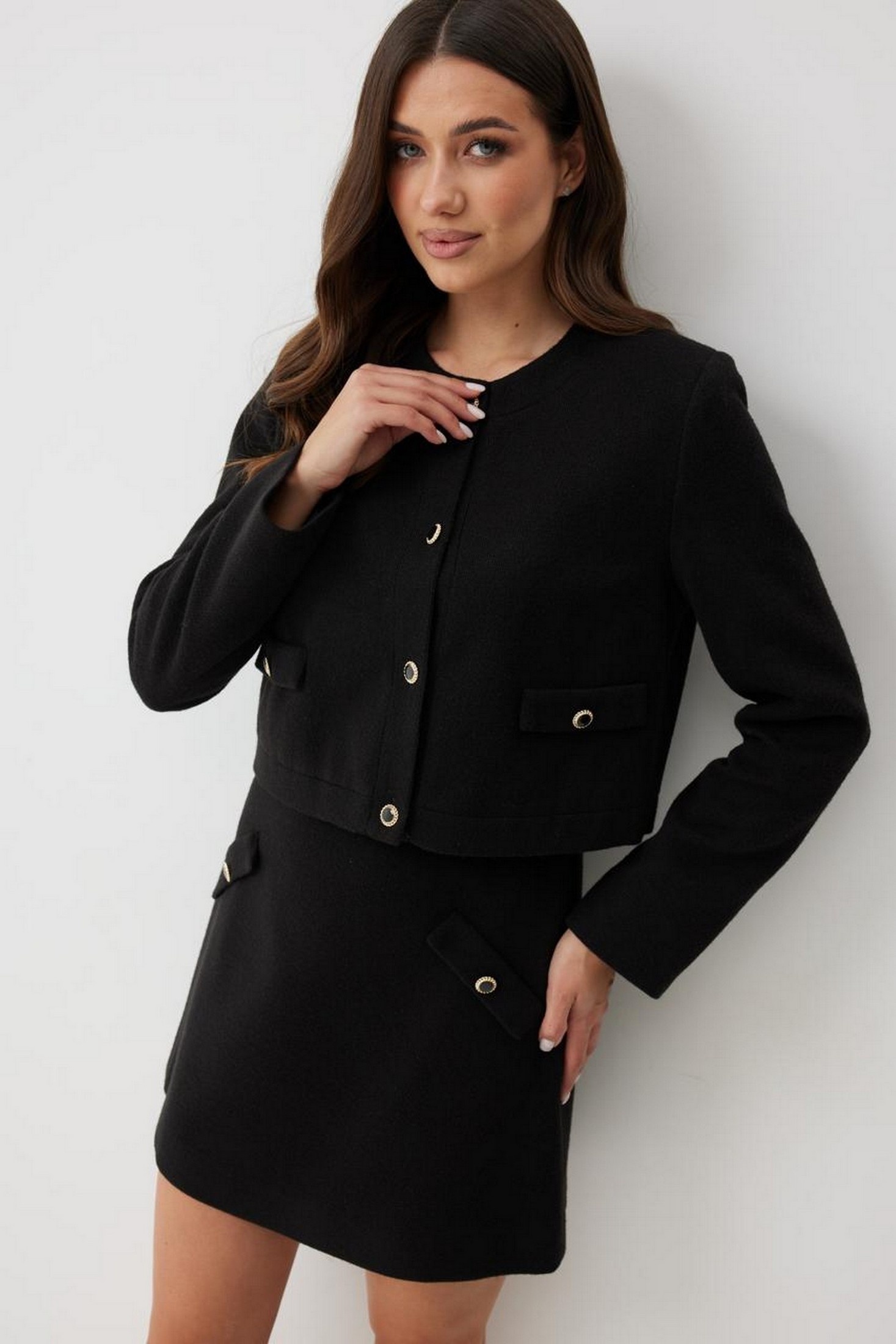 Элегантный укороченный жакет в стиле Шанель. Жакет прямого силуэта, выполнен из трикотажного полотна. Модель с округлым вырезом горловины, без воротника. Застёжка центральная на петли и декоративные пуговицы с жемчужными вставками, которые добавляют акцент и подчёркивают женственность. По полочке имитация карманов с клапанами, также украшенными пуговицами. Рукава длинные, втачные. Спинка прямая, без среднего шва. Жакет полностью на поливискозной подкладке.