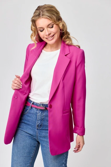 Жакет и ремень. Яркий свободный жакет застегивается на одну петлю и пуговицу. По переду прорезные карманы. Рукав длинный втачной двушовный, можно подвернуть на манжет. Воротник и лацканы пиджачного типа. Подкладка в тон жакета.