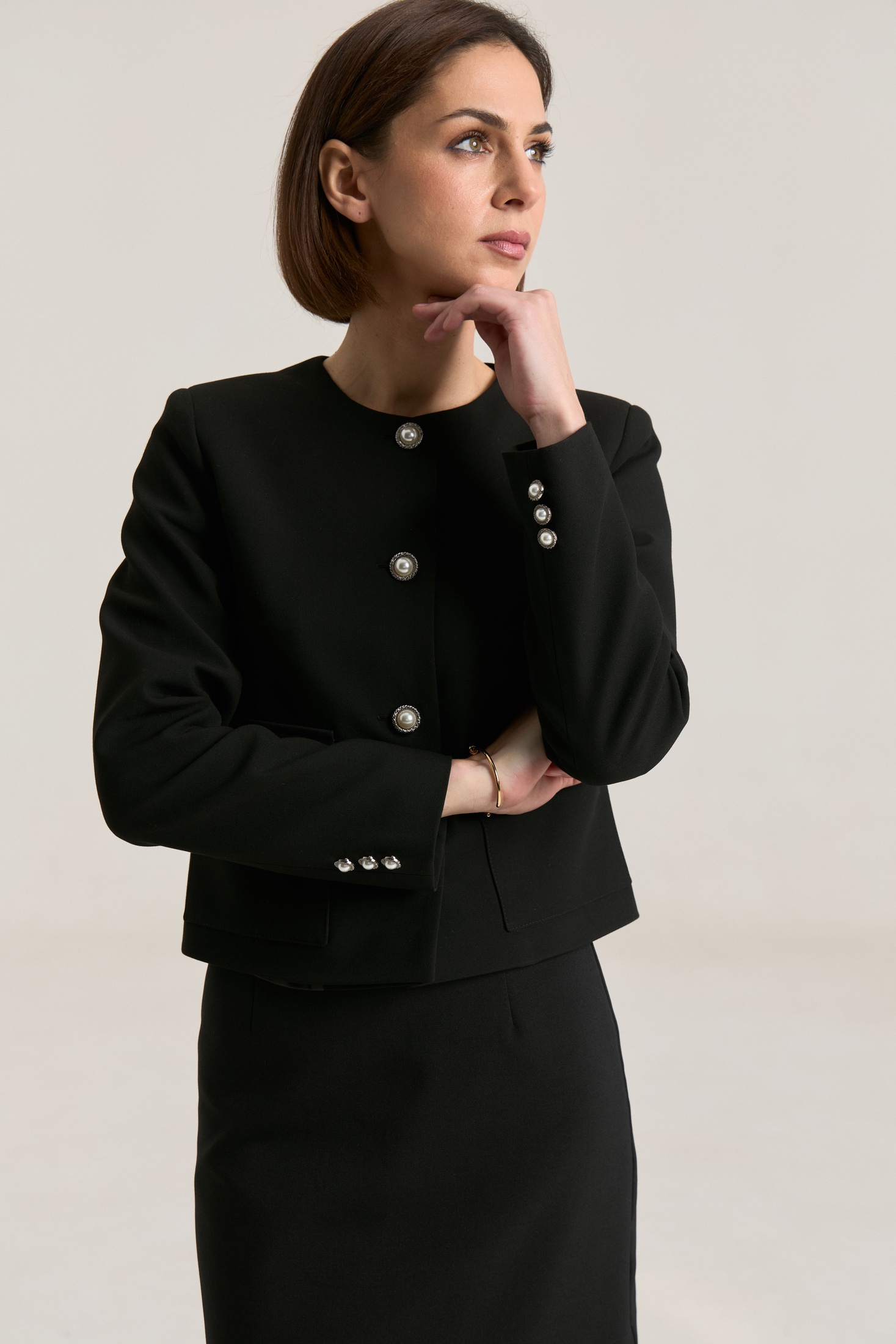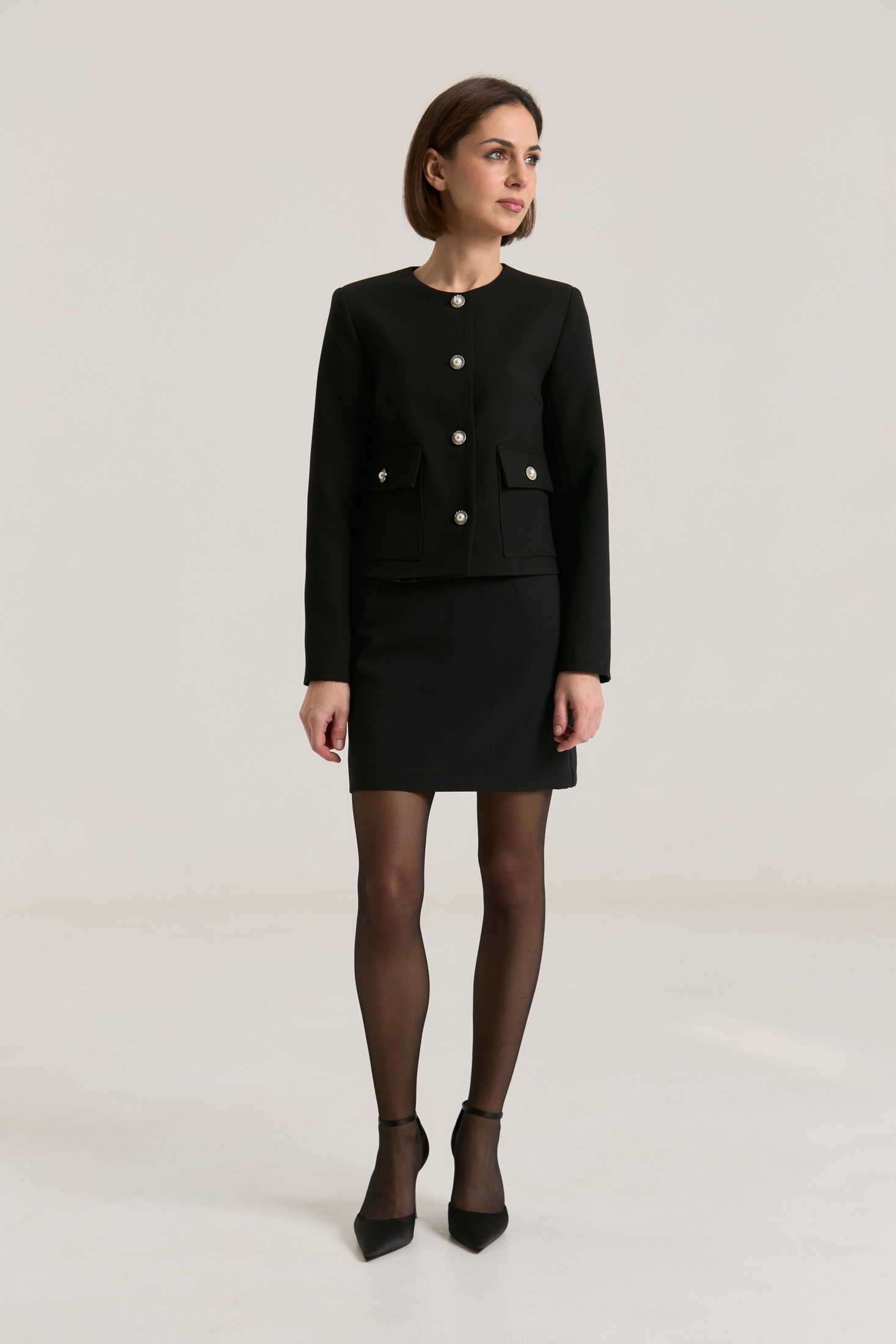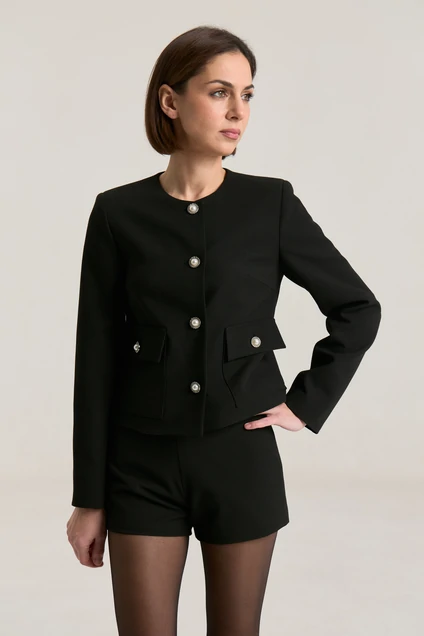 Жакет укороченный, , прямого силуэта, с втачными рукавами , горловина округлой формы, без воротника.По бокам накладные функциональные карманы с застежкой на петлю-пуговицу. Застёжка жакета центральная однабортная на петли и пуговицы. спинка со средним швом и рельефами без шлиц и пуговиц. Жакет на подкладке.